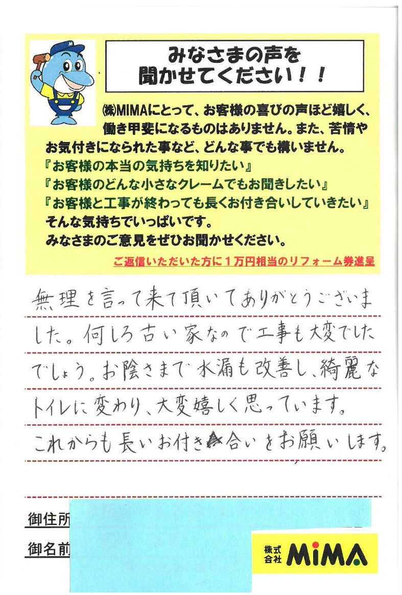 無理を言って来て頂いてありがとうございました。何しろ古い家なので工事も大変でしたでしょう。お陰様で水漏れも改善し、綺麗なトイレに変わり大変嬉しく思っています。