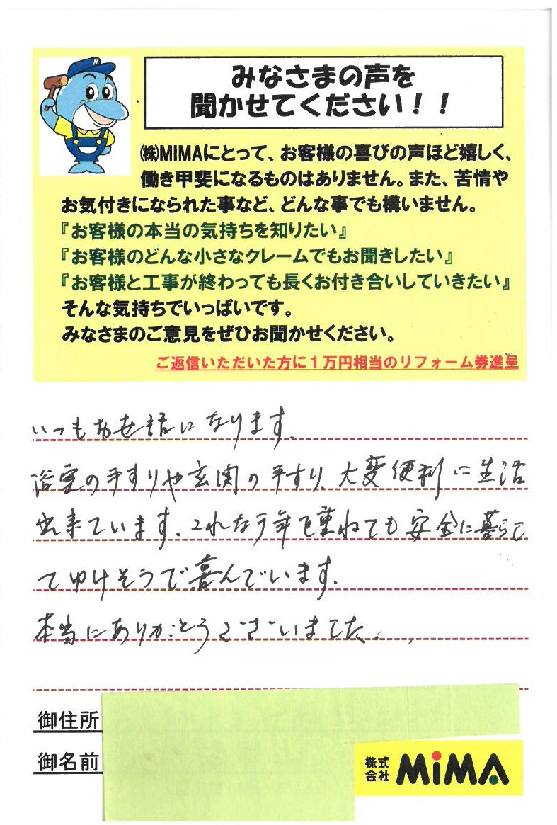 いつもお世話になります。浴室手すりや玄関の手すり、大変便利に生活出来ています。これなら年を重ねても安全に暮らしてゆけそうで喜んでいます。
