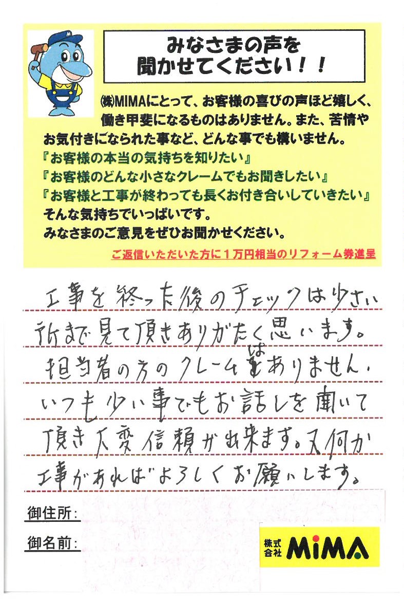 工事を終った後のチェックは小さい所まで見て頂きありがたく思います。担当者の方のクレームはありません。いつも少ない事でもお話を聞いて頂き大変信頼ができます。