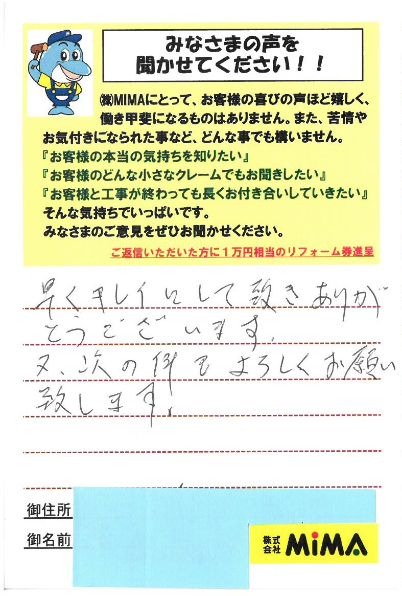 早くキレイにして頂きありがとうございます。又、次の件もよろしくお願い致します。