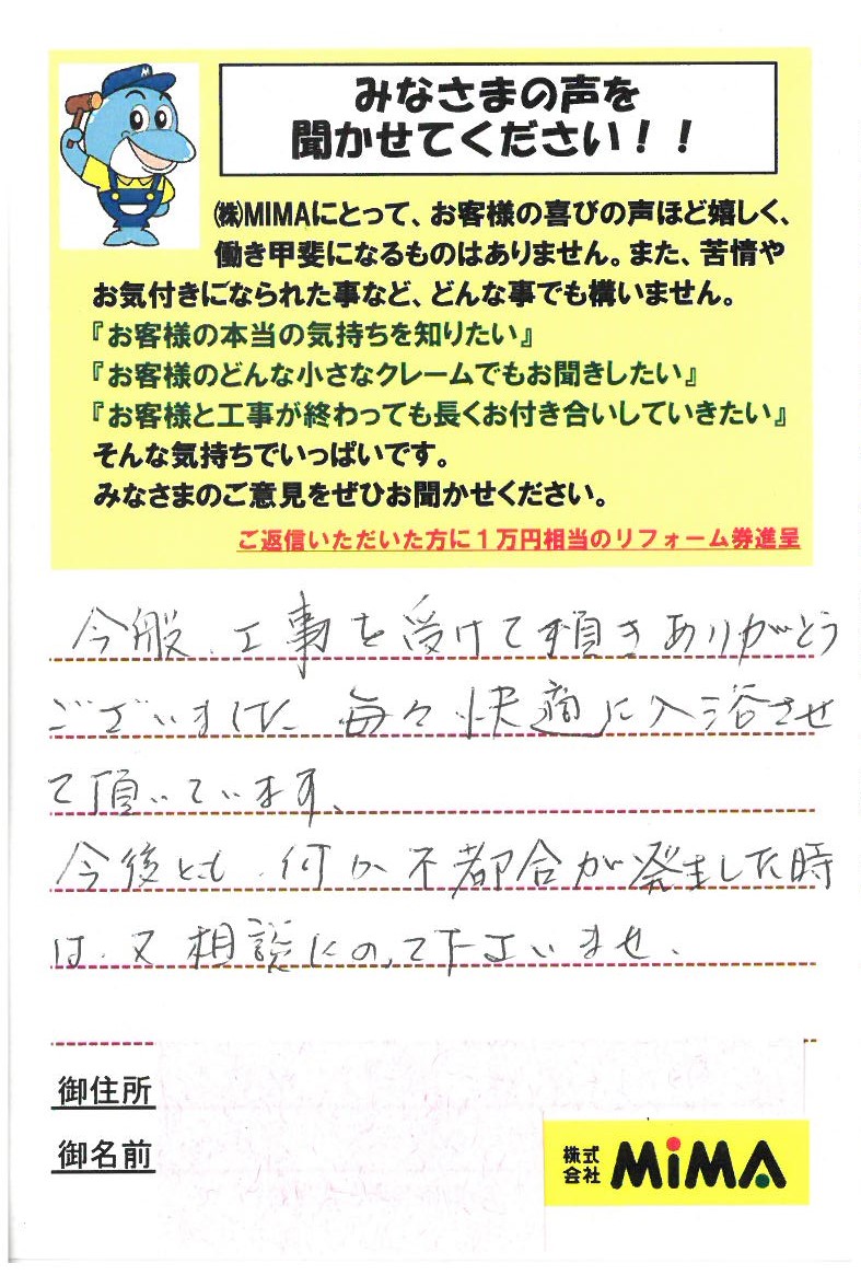 今般、工事を受けて頂きありがとうございました。毎日、快適に入浴させて頂いています。今後とも何か不都合が発生した時は、又相談にのって下さいませ。