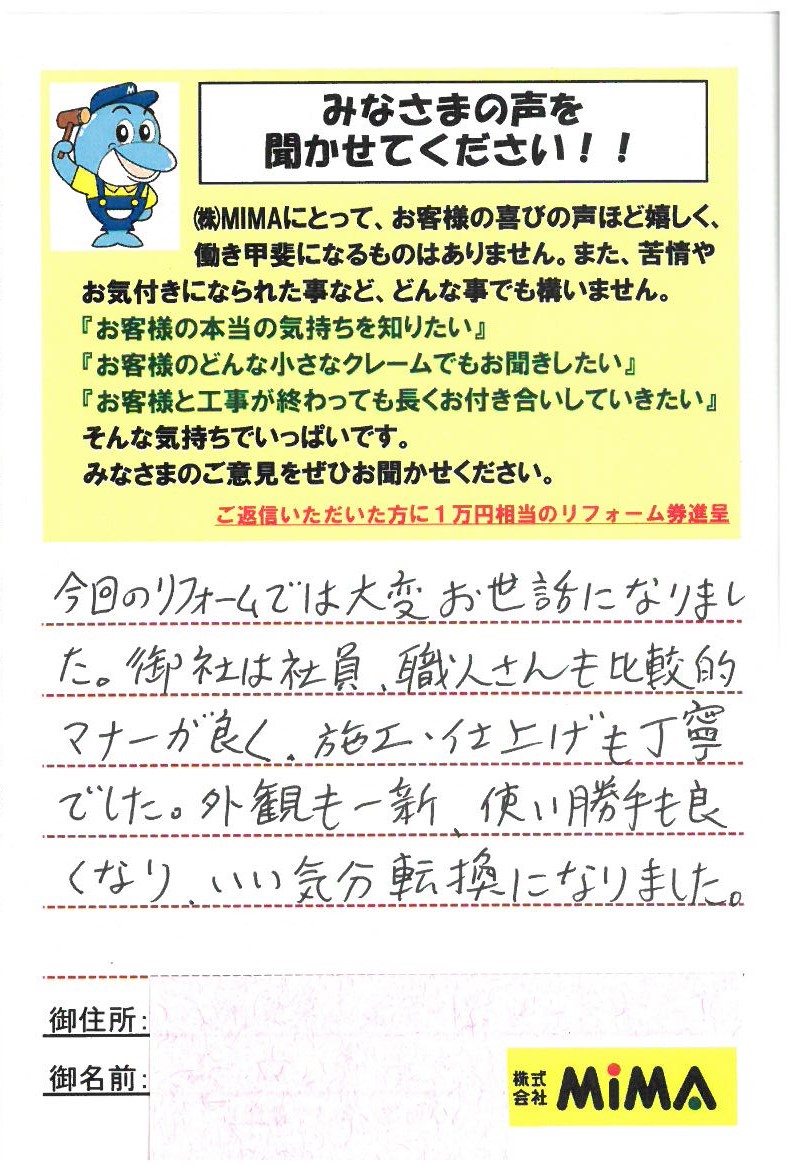 今回のリフォームでは大変お世話になりました。御社は社員、職人さんも比較的マナーが良く、施工・仕上げも丁寧でした。