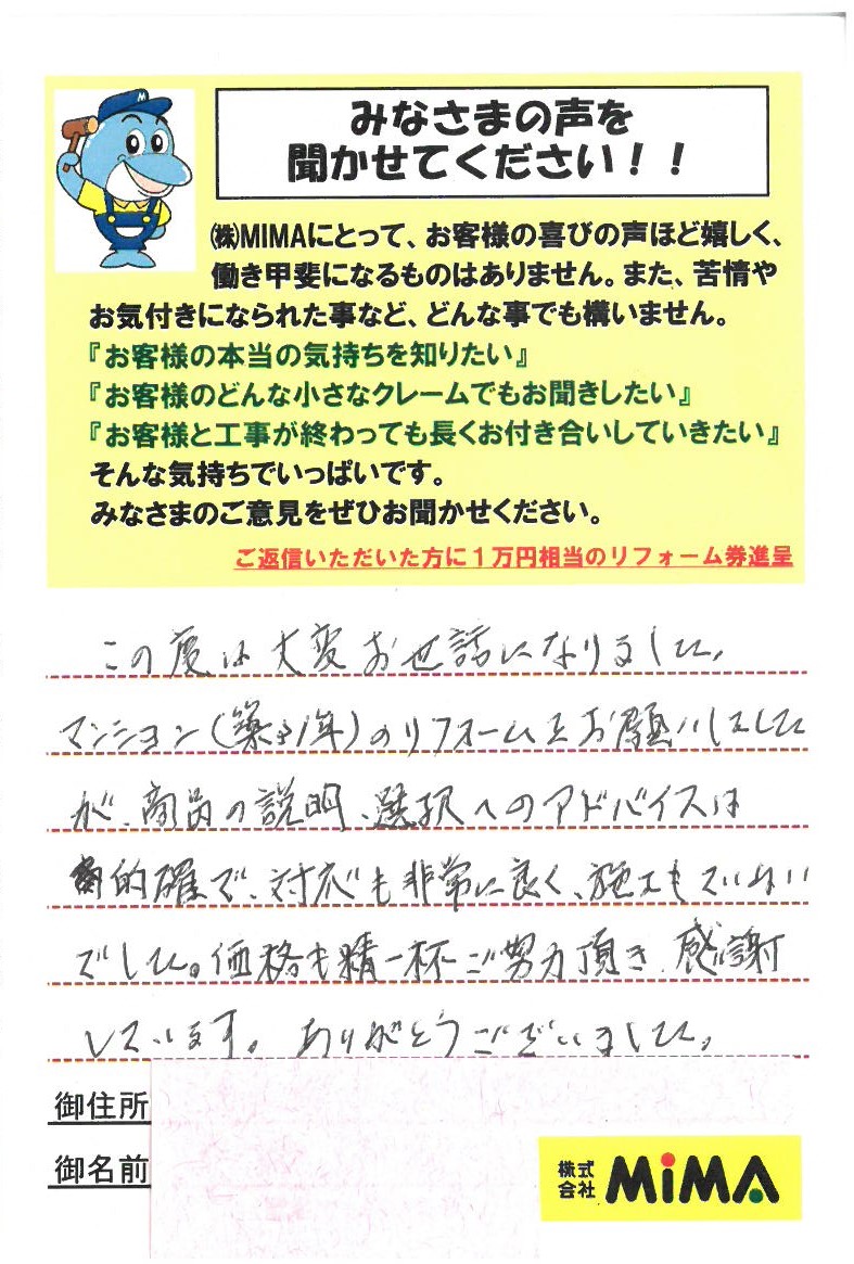 この度は大変お世話になりました。マンション(築31年)のリフォームをお願いしましたが、商品の説明・選択へのアドバイスは的確で、対応も非常に早く施工も丁寧でした。