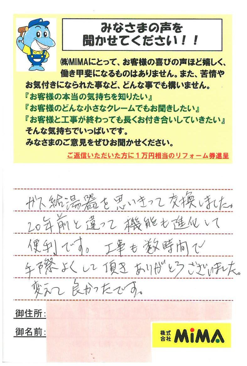 ガス給湯器を思いきって交換しました。20年前と違って機能も進化して便利です。工事も数時間で手際よくして頂きありがとうございました。変えて良かったです。