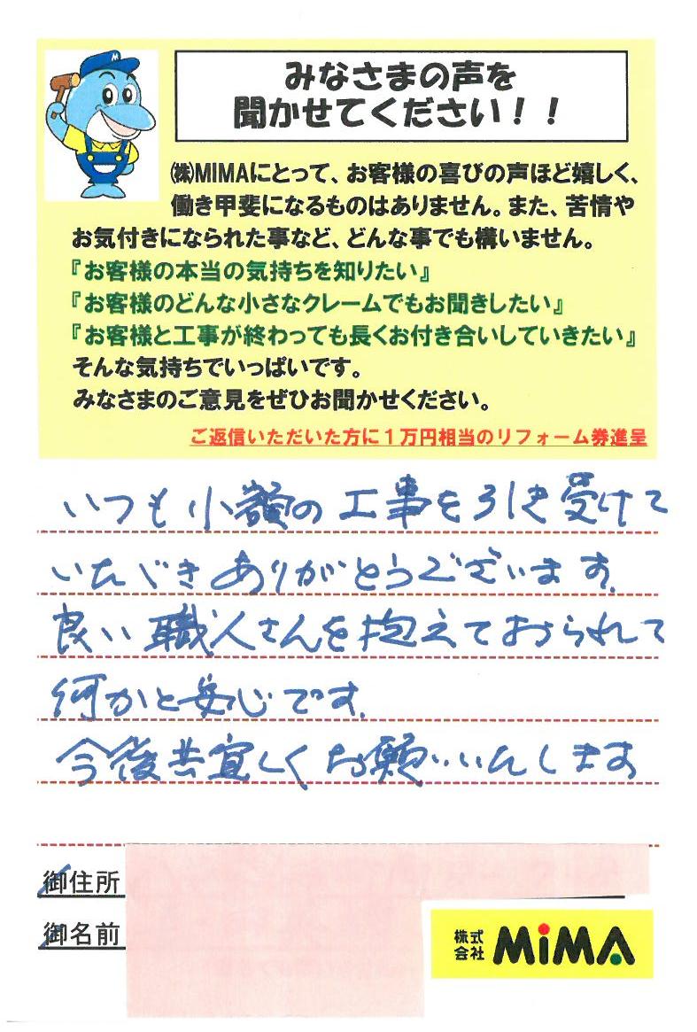 いつも小額の工事を引き受けていただきありがとうございます。良い職人さんを抱えておられて何かと安心です。今後共、宜しくお願いいたします。