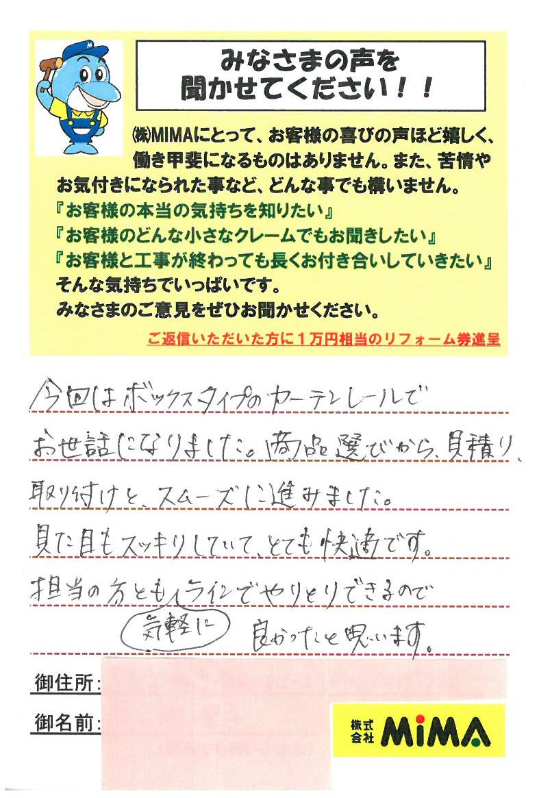 今回はボックスタイプのカーテンレールでお世話になりました。商品選びから、見積り、取り付けとスムーズに進みました。見た目もスッキリしていて、とても快適です。担当の方とも気軽にラインでやりとりできるので、良かったと思います。