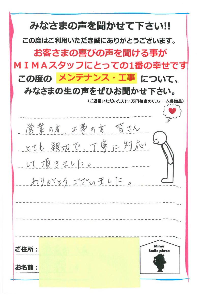 営業の方、工事の方、皆さんとても親切で、丁寧に対応して頂きました。ありがとうございました。
