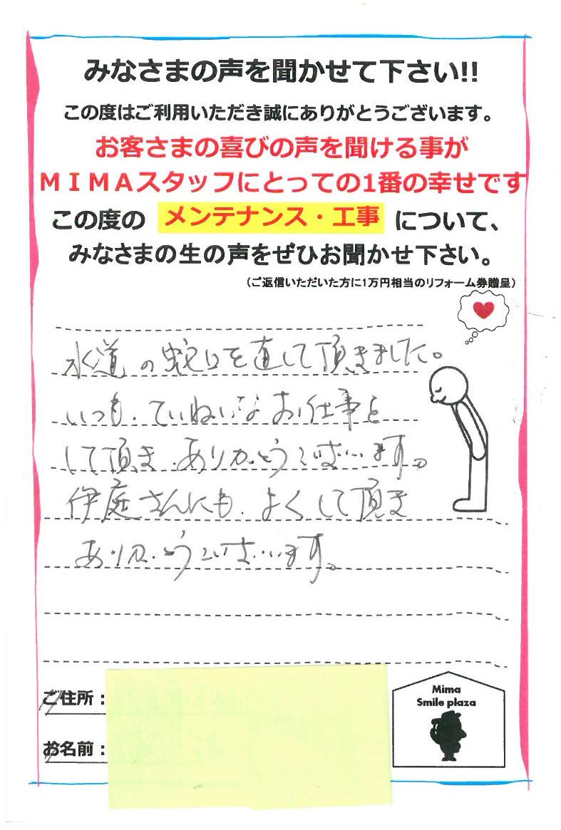 水道の蛇口を直して頂きました。いつもていねいなお仕事をして頂き、ありがとうございます。伊庭さんにもよくして頂きありがとうございます。