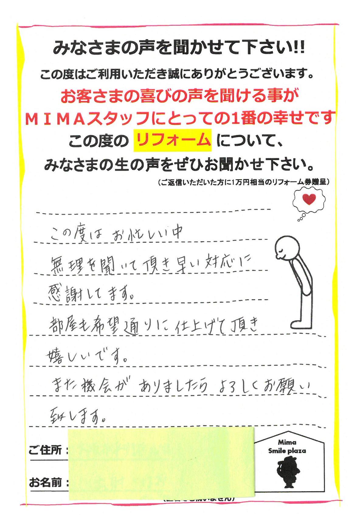 この度はお忙しい中、無理を聞いて頂き、早い対応に感謝してます。部屋も希望通りに仕上げて頂き嬉しいです。また機会がありましたらよろしくお願い致します。
