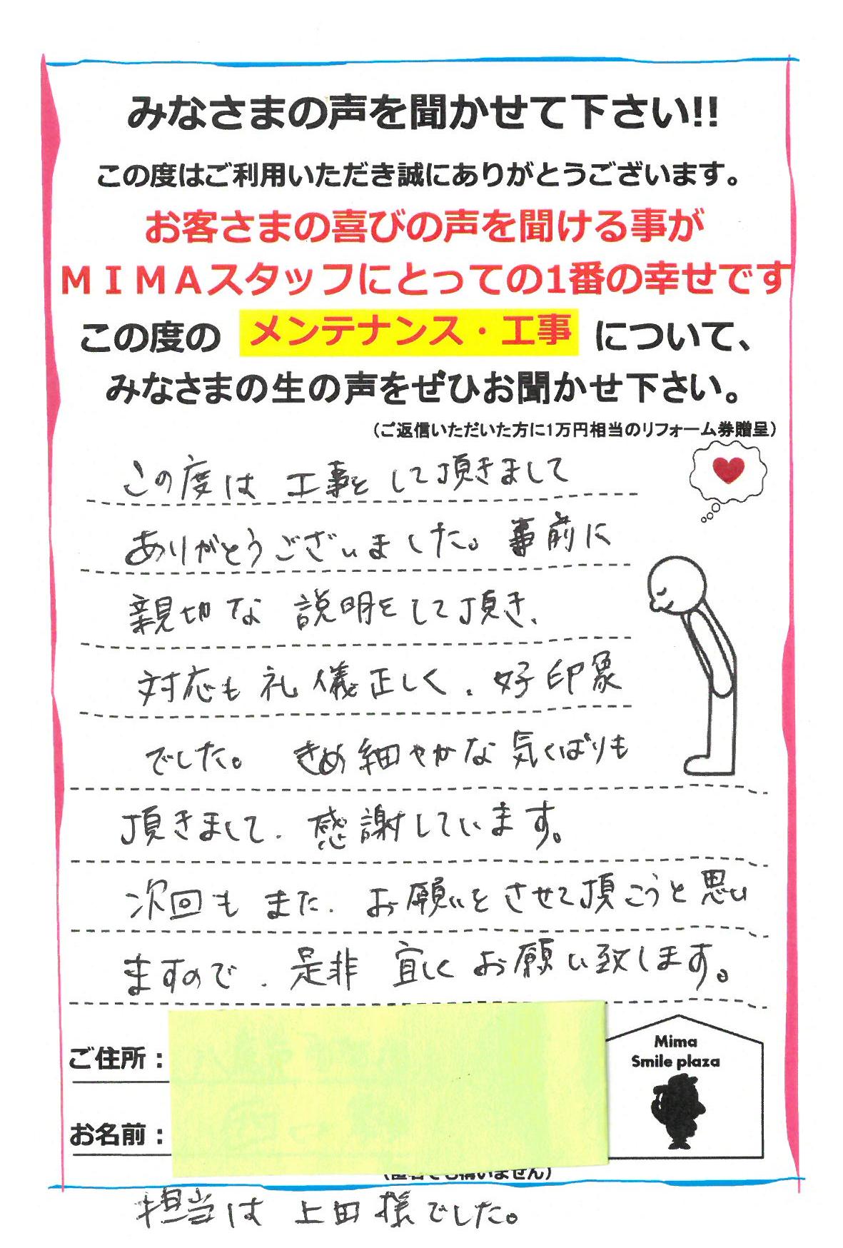 この度は工事をして頂きましてありがとうございました。事前に親切な説明をして頂き、対応も礼儀正しく、好印象でした。きめ細やかな気くばりも頂きまして、感謝しています。次回もまたお願いをさせて頂こうと思いますので、是非、宜しくお願い致します。担当は上田様でした。