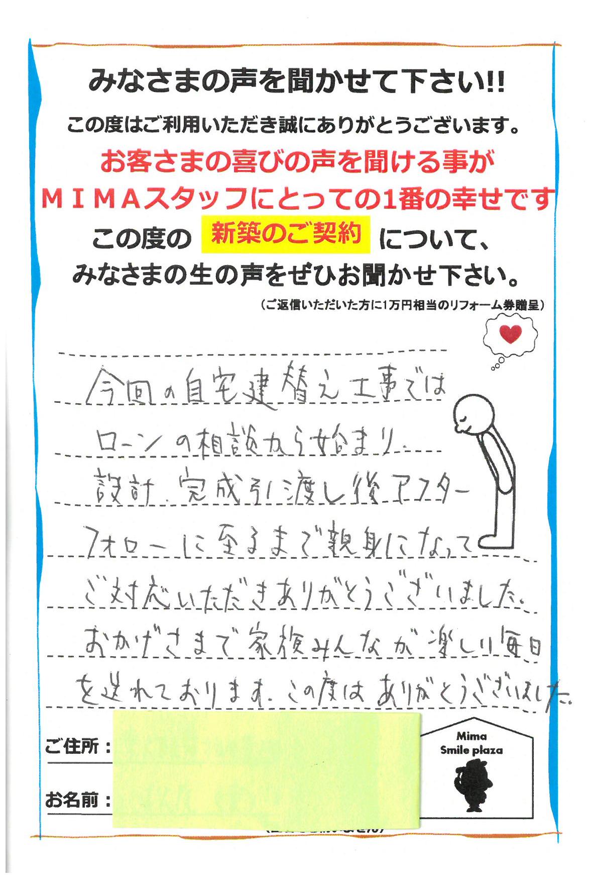 今回の自宅建替え工事では、ローンの相談から始まり、設計、完成引き渡し後アフターフォローに至るまで、親身になってご対応いただきありがとうございました。おかげさまで家族みんなが楽しい毎日を送れております。この度はありがとうございました。