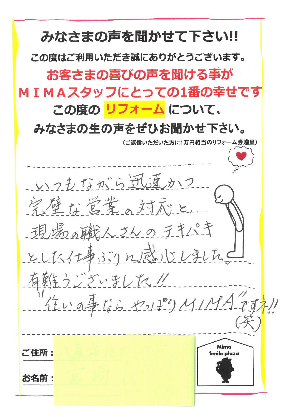 いつもながら迅速かつ完璧な営業の対応と、現場の職人さんのテキパキとした仕事ぶりに感心しました。有難うございました!! ”住まいの事ならやっぱりMIMA”ですネ!!(笑)