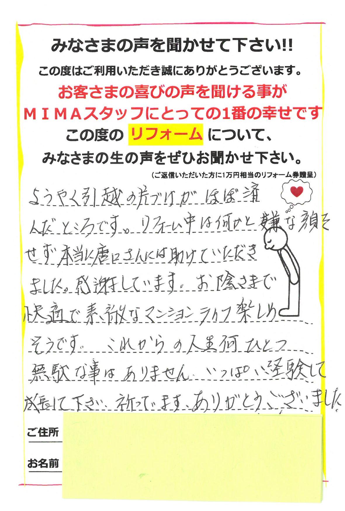 ようやく引越の片づけがほぼ済んだところです。リフォーム中は何かと嫌な顔をせず本当に唐口さんには助けていただきました。感謝しています。お陰さまで快適で素敵なマンションライフ楽しめそうです。これからの人生何ひとつ無駄な事はありません。いっぱい経験して成長して下さい。祈っています。ありがとうございました。