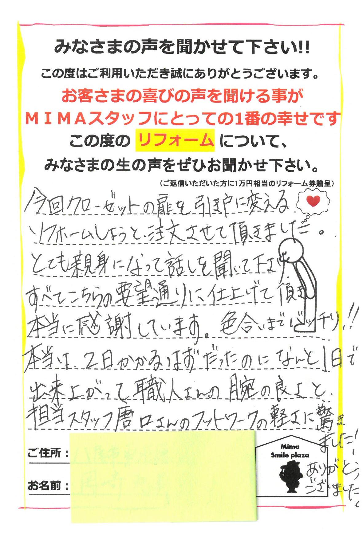 今回クローゼットの扉を引き戸に変えるリフォームしようと注文させて頂きました。とても親身になって話を聞いて下さり、すべてこちらの要望通りに仕上げて頂き本当に感謝しています。色合いまでバッチリ!!本当は2日かかるはずだったのに、なんと1日で出来上がって職人さんの腕の良さと、担当スタッフ唐口さんのフットワークの軽さに驚きました!ありがとうございました。