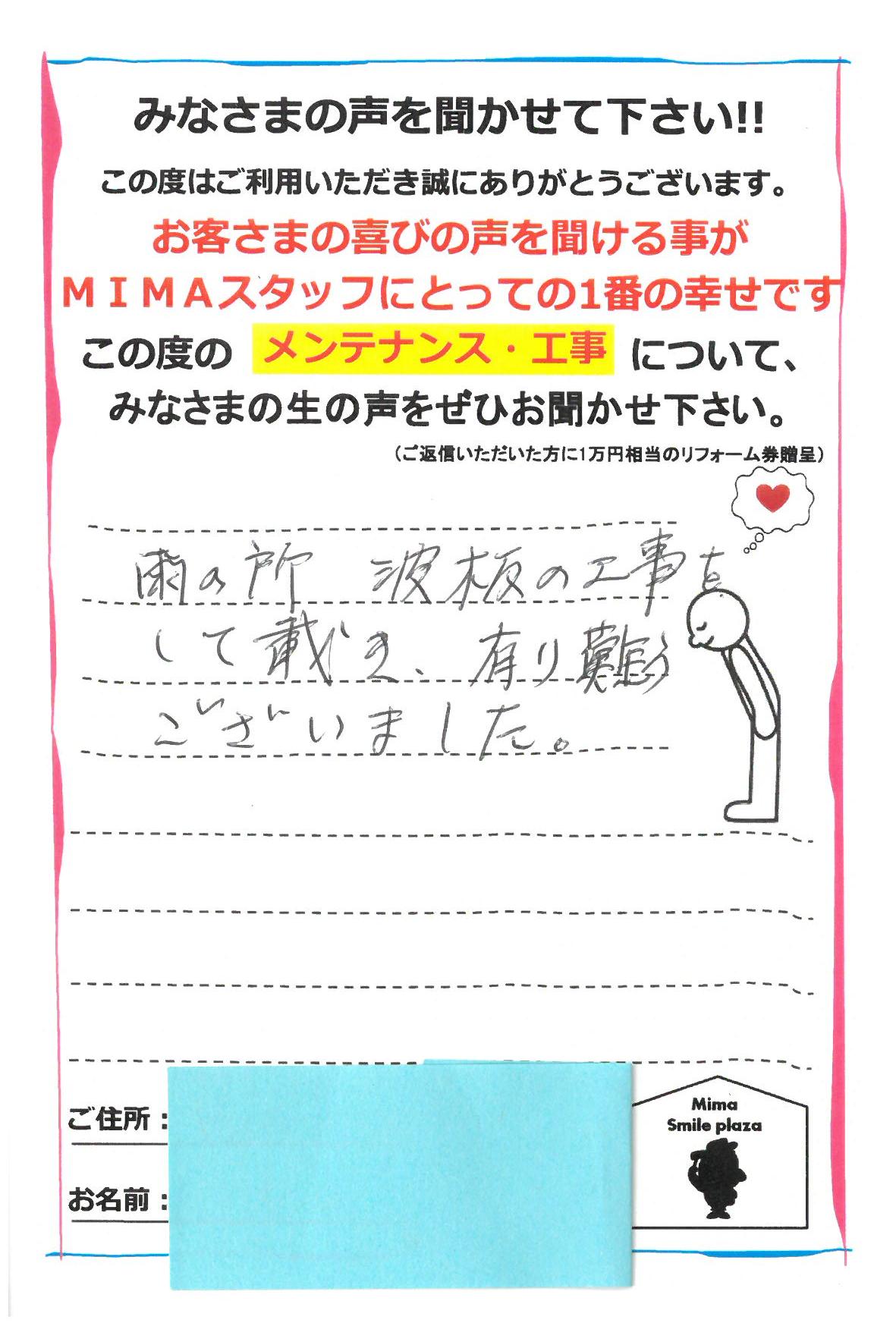 雨のところ、波板の工事をして戴き、有り難うございました。