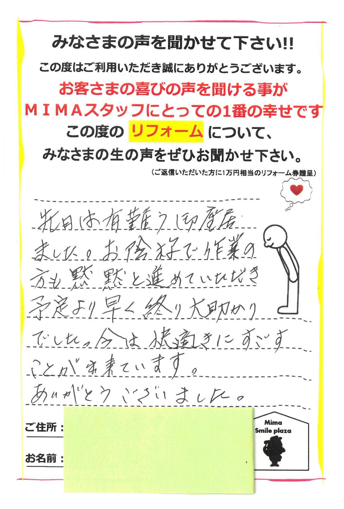 先日は有難う御座いました。お蔭様で作業の方も黙々と進めていただき、予定より早く終り大助かりでした。今は快適に過ごすことが出来ています。ありがとうございました。