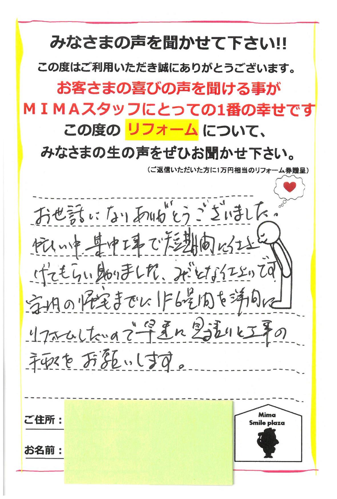 お世話になりありがとうございました。忙しい中、集中工事で短期間に仕上げてもらい助かりました。みごとな仕上りです。家内の帰宅までに1F6畳間を洋間にリフォームしたいので、早急に見積と工事の手配をお願いします。