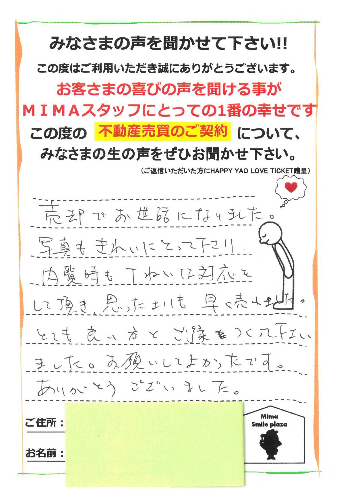 売却でお世話になりました。写真もきれいにとって下さり、内覧時も丁ねいな対応をして頂き、思ったよりも早く売れました。とても良い方とご縁をつくって下さいました。お願いしてよかったです。ありがとうございました。