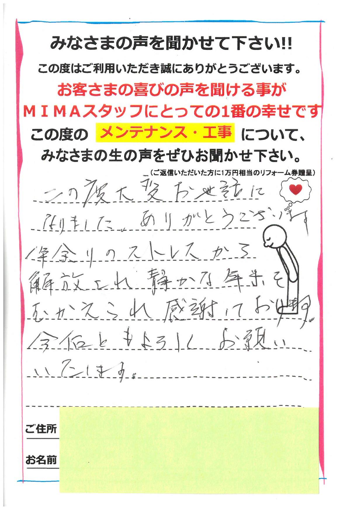 この度、大変お世話になりました。ありがとうございます。1年余りのストレスから解放され、静かな年末むかえられ感謝しています。今後ともよろしくお願いいたします。