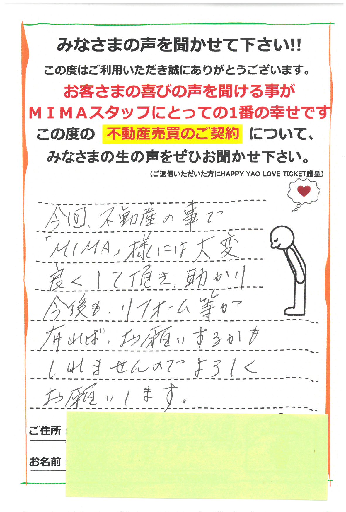 今回不動産の事で「MIMA」様には大変良くして頂き助かり、今後もリフォーム等が有ればお願いするかもしれませんのでよろしくお願いいたします。