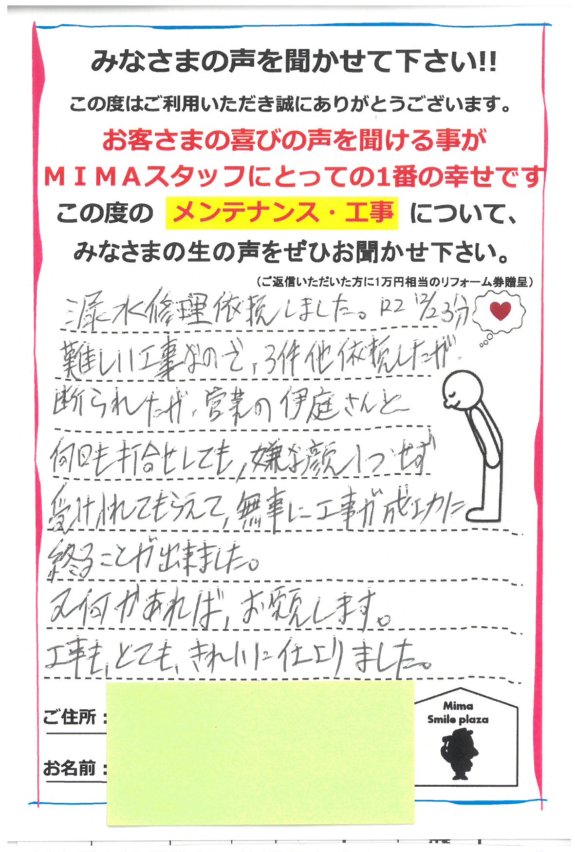 漏水修理依頼しました。難しい工事なので、3件他依頼したが断られたが、営業の伊庭さんと何回も打ち合わせしても、嫌な顔1つせず受け入れてもらえて、無事に工事が成功に終わることが出来ました。又何かあれば、お願いします。工事もとてもきれいに仕上がりました。