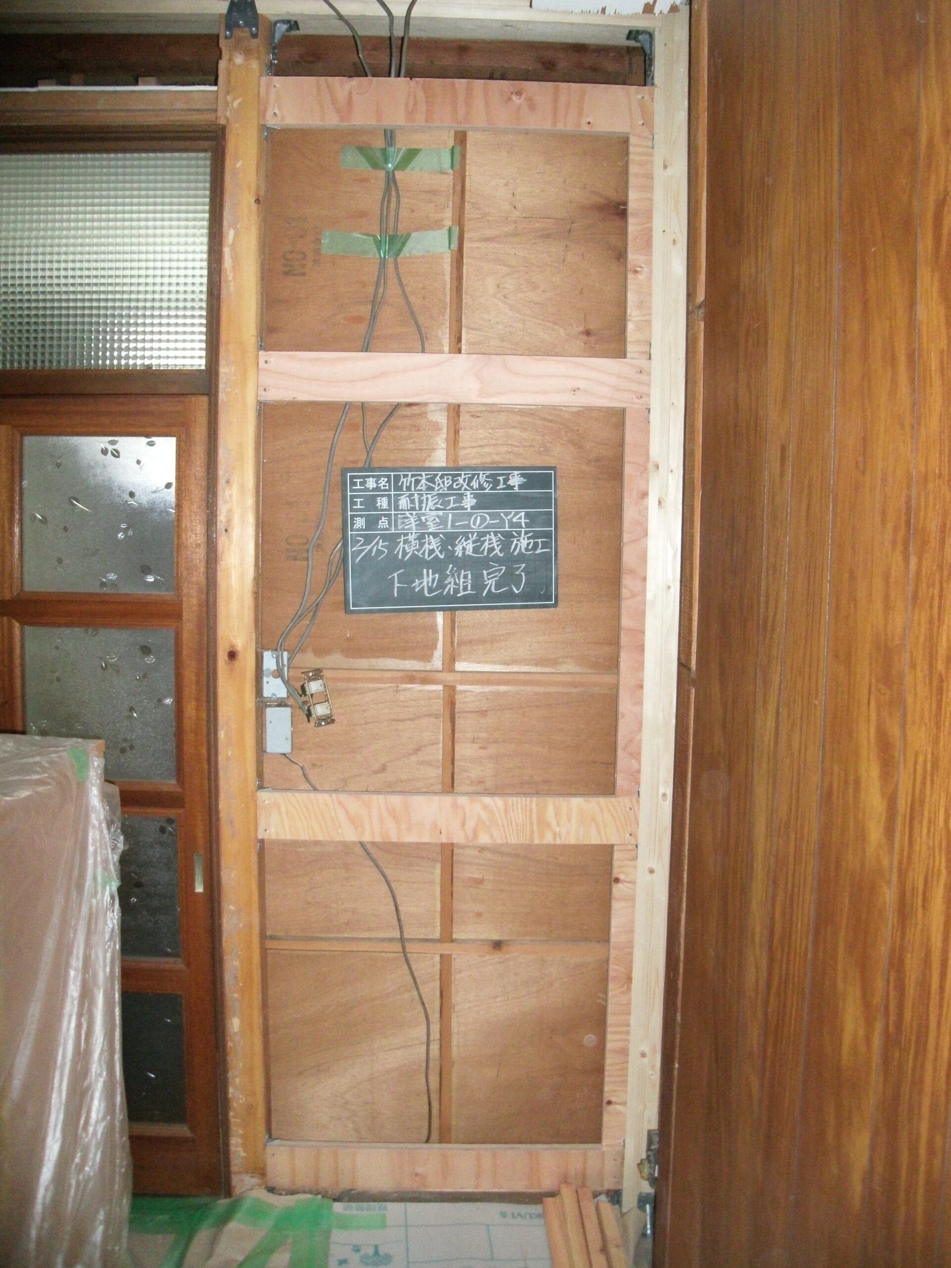 耐力を取るため、筋交の代わりに耐震補強材(かべ大将)の下地材を取り付けました。強度UP!!