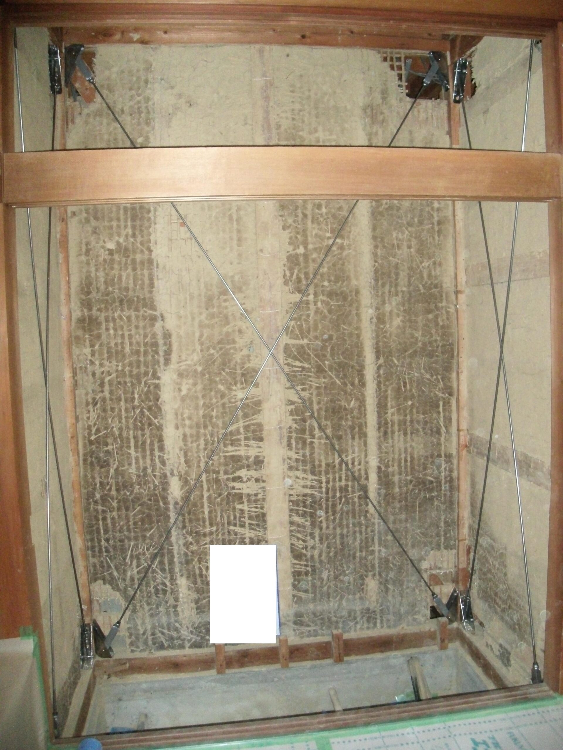 八尾市の耐震の補助金を利用し、耐震リフォームを行いました。押入れ内部にコボットブレースという筋かいを取付させて頂きました。このコボットブレースの特徴は木製の筋かいと違い、引っ張られる力に非常に強く、地震が来た時に柱が抜ける力も木製の筋かいの場合に比べ抑えることができる優れものです。ちなみに押入れ内部は仕上げ材が安く抑えられ、また回りの部屋への影響が少ない為、コストを抑えることができます。