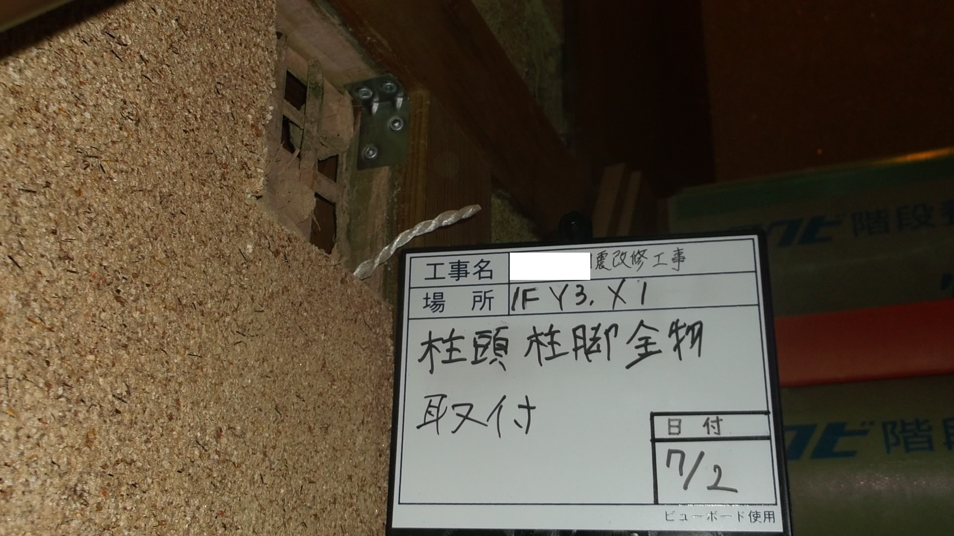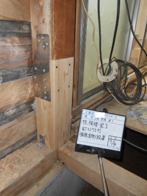 壁の中に隠れる部分にプレートを取付け、既存柱と新設柱が離れないようにしました。柱正面からは耐震専用の釘を打ちつけ、塗装をして補修しました。