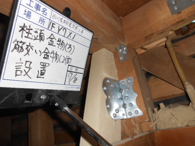 筋かいを取付た後は確りと柱と筋かいを固定します。柱と土台・梁も金物で確りと固定します。