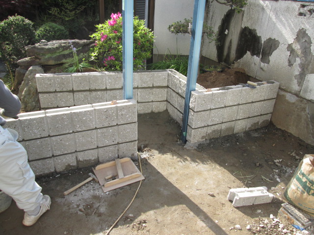 化粧ブロックを積んでいるところです。 門扉の柱は先に建てました。