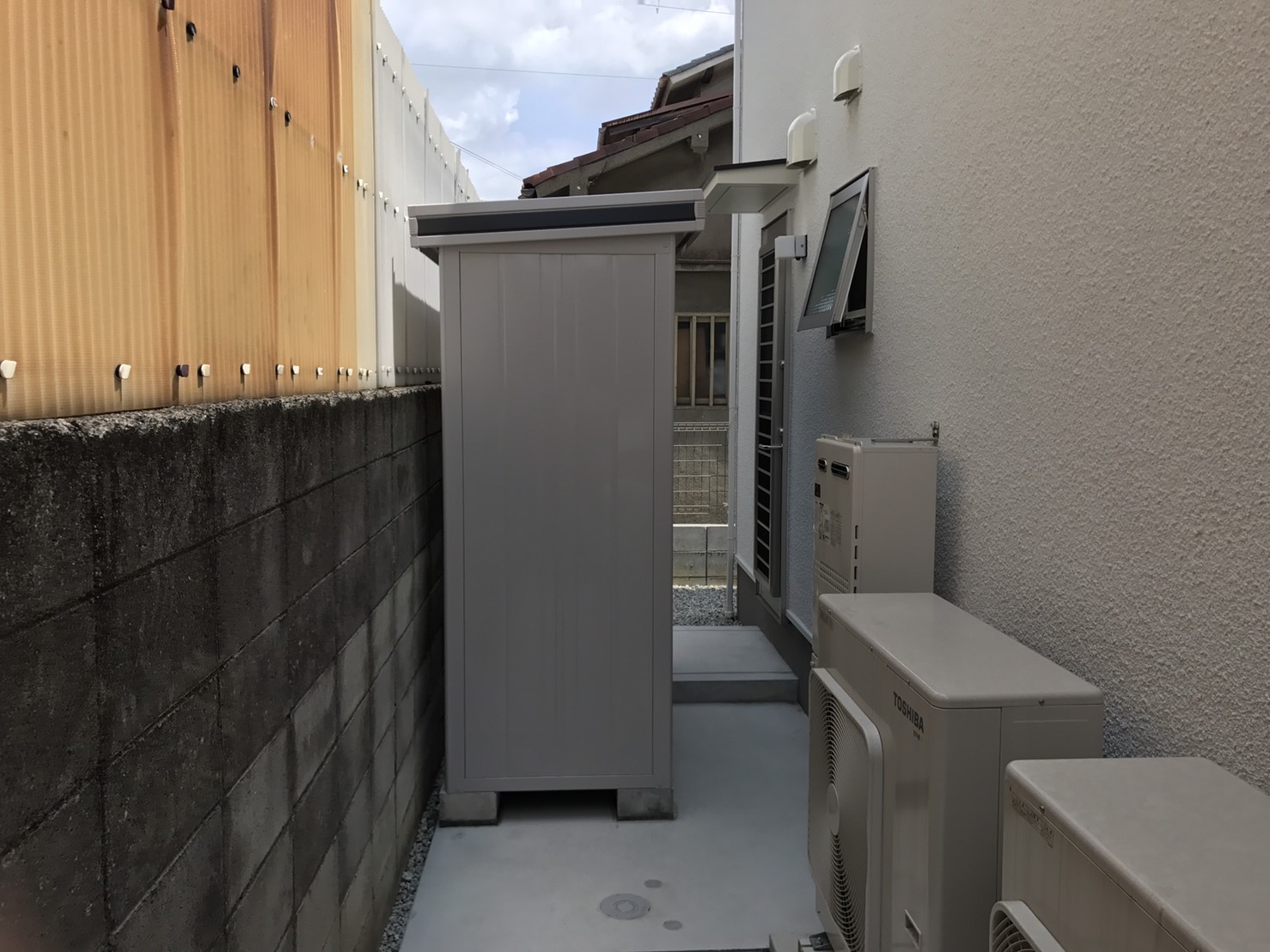 敷地内に、物置を設置しました。 CMで、よくある「100人乗っても~」のメーカーより、洗練されている感じで、 ヨド物置のエルモ、お勧めです!