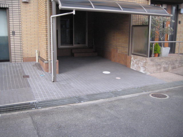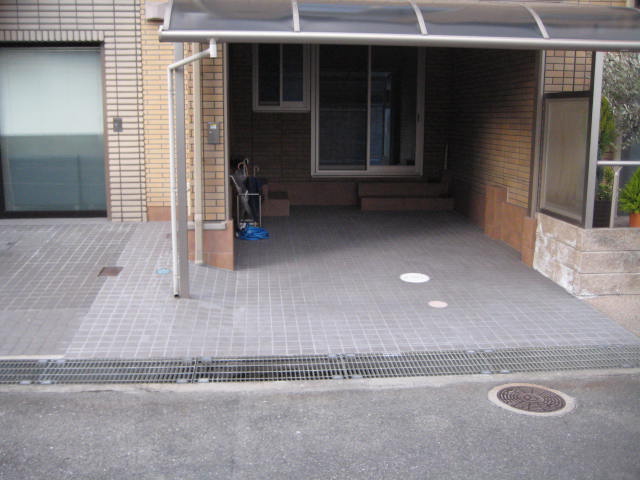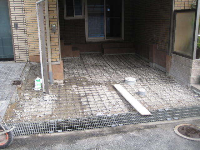 20年経った洗い出しの土間・・・苔も生えて汚れがめだってきました。 コンクリートでタイル下地をして、磁器タイルを貼りました。