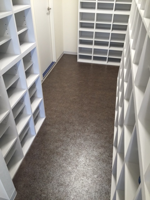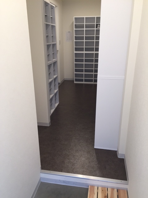 白ベースで 足元はシックなブラウン系の塩ビタイルを貼りました。白のシューズBOXがとても清潔感を表しています~
