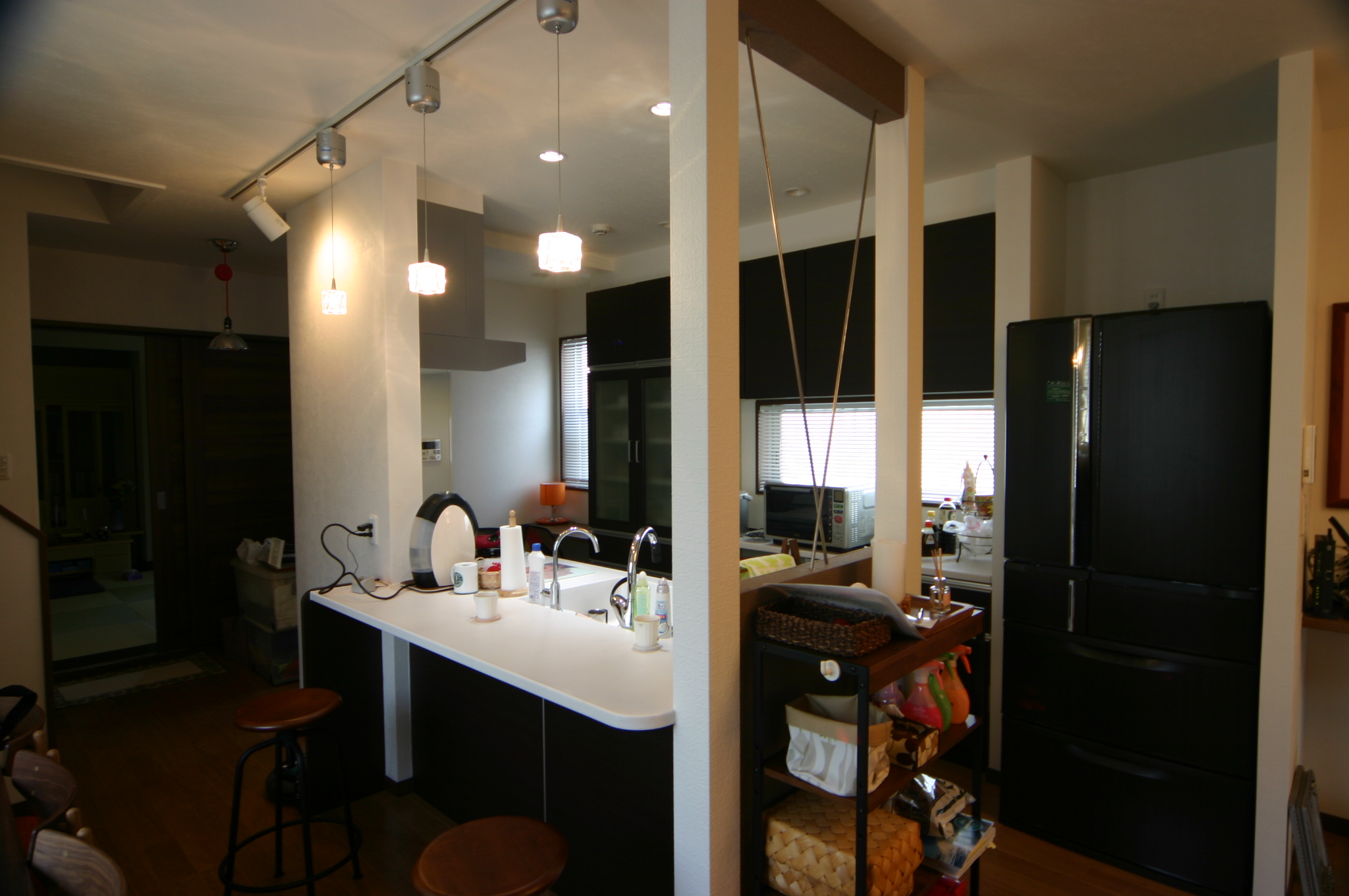 元和室の場所にリビングを持ってきました。 閉鎖的な壁を取ってしまってキッチン・ダイニングとつなぎました。