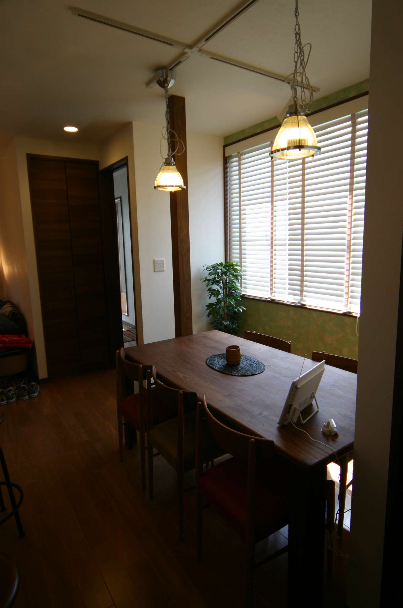 ダイニングの照明もいい感じです。落ち着いた色のテーブルに大きな窓から自然の光が差し込みます。