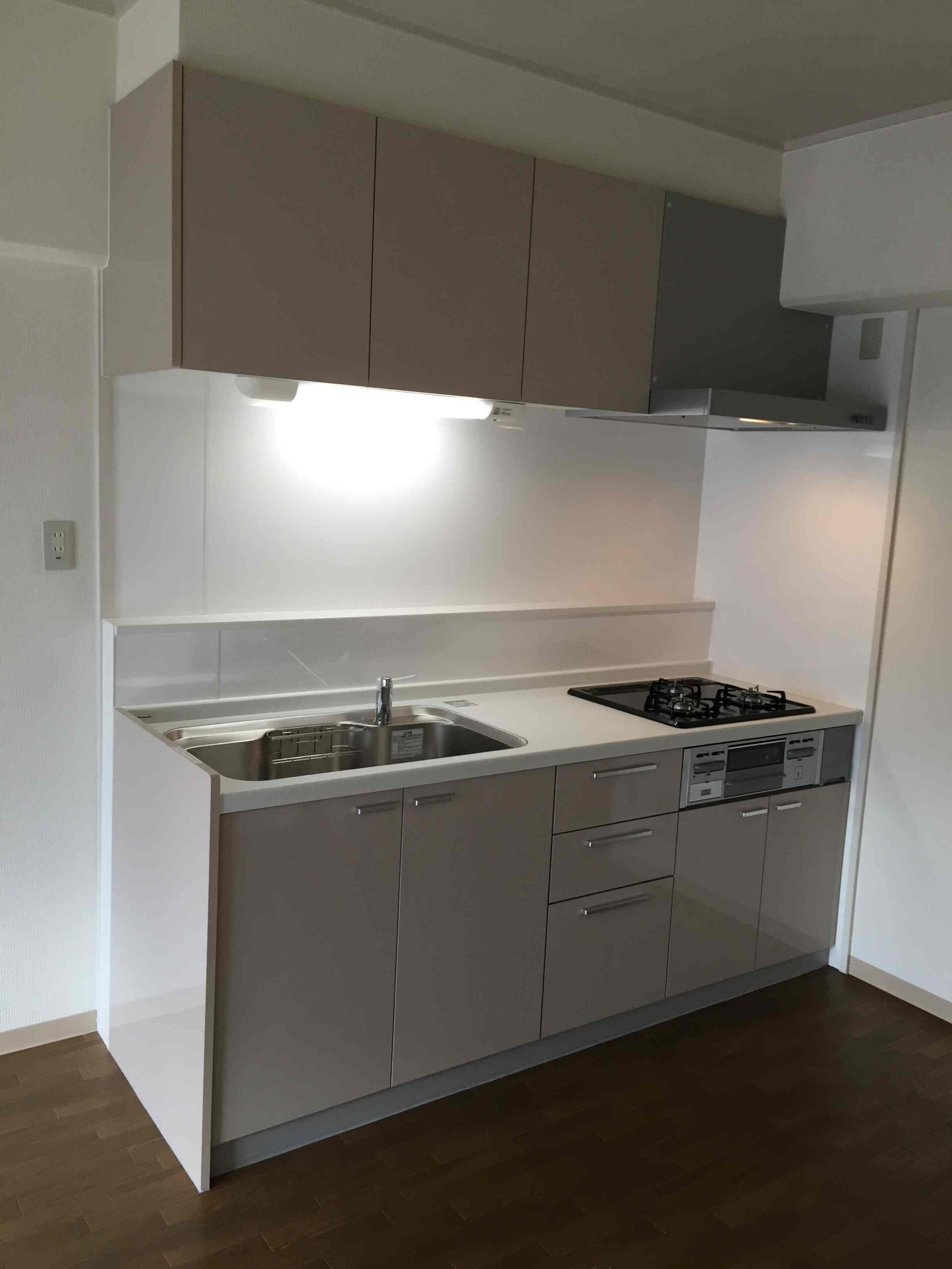 マンションのキッチンをpanasonicのVスタイルに取替させて頂きました。既存タイル部分にはキッチンパネルという表面がツルッとした掃除ラクラクのパネルを張り、正面には小物等を置くためのカウンターを造作しました。