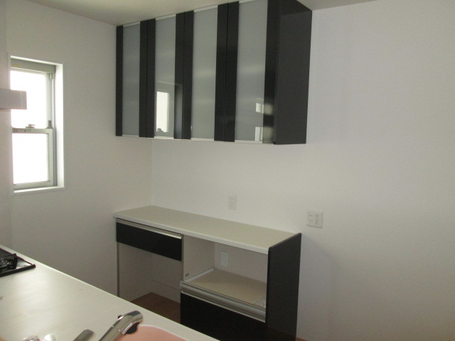 同時に取付させていただきました収納ユニットがこちらです。 電子レンジや炊飯器、トースターを置くスペースがちゃんとあります☆ キッチンと同じカラ―で統一感がGoodですね。
