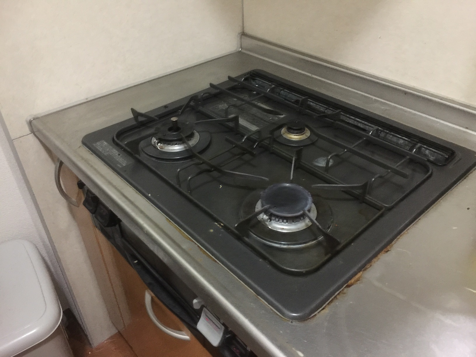 ずっと使い続けていたビルトインコンロです。 コンロの周りに付いた汚れが少し気になりますね。