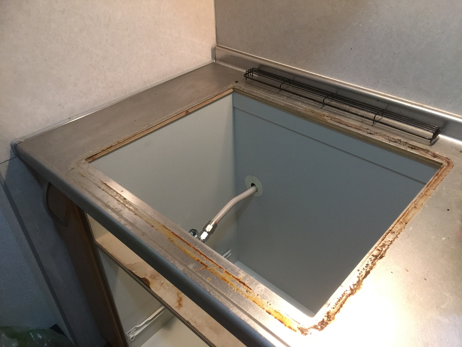 コンロ取り外します。 コンロはネジを外すとガポっと一気に取り外すことができます。