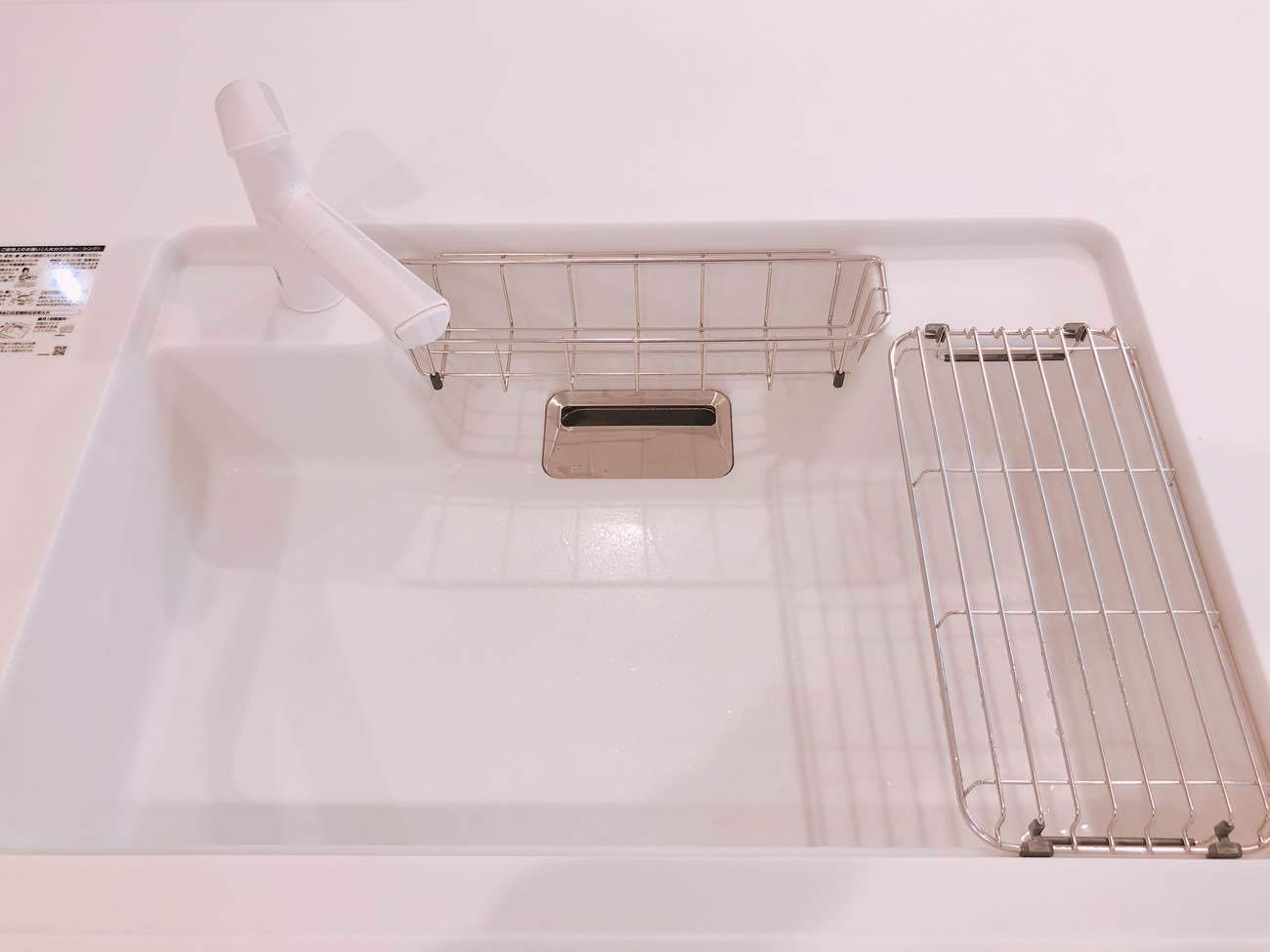 天板に合わせて、シンクの中も、水栓も白で統一しました。水栓はシンプルですが、シャワーに切り替えれますし、ホースも引き出せるのでお掃除がラクになります。