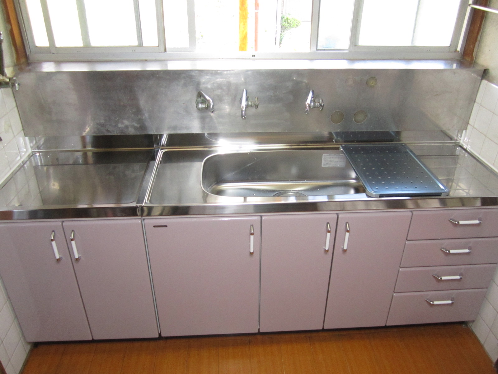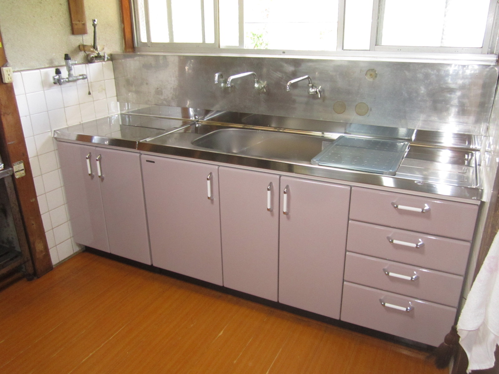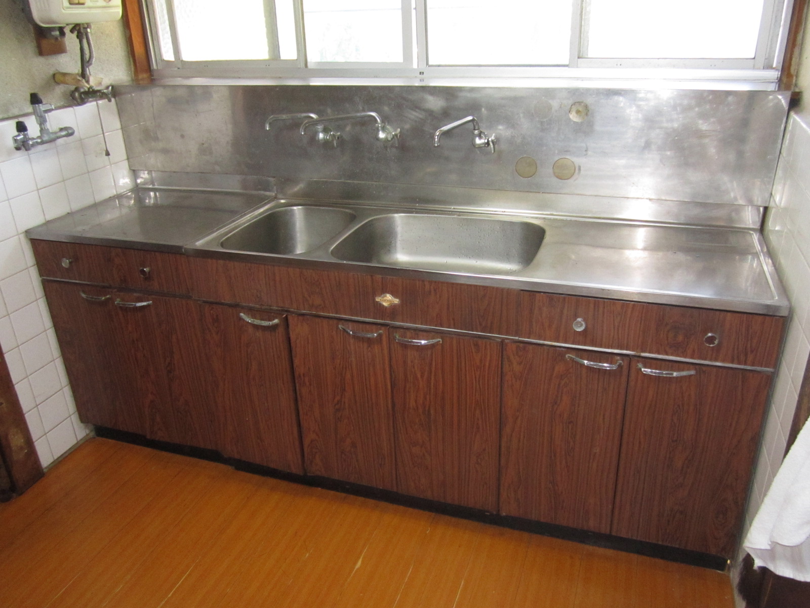大型シンクに引き出しの付いたタイプ。同じサイズの調理台とシンクで収めました。少し排水位置が変わったので、配管を移動しました。