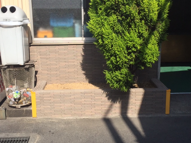 コンクリートブロックからタイル貼り花壇に変更しました。綺麗なタイルですよ!!