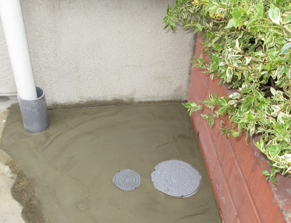 コンクリート桝を取り除き、臭いがお部屋にあがらないように、トラップ桝に交換しました。