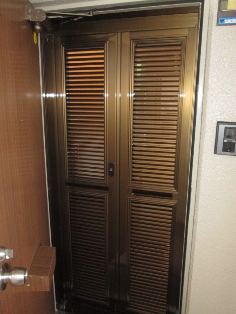 こちらは、とあるマンションの玄関です。 室内に風の通り道を作るため、この玄関に網戸を 取付させていただきました。