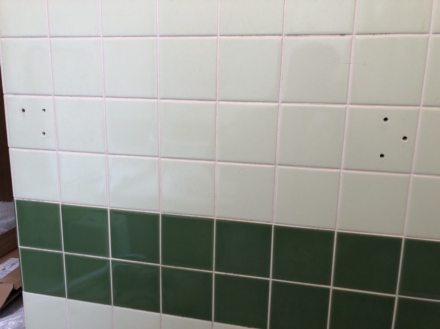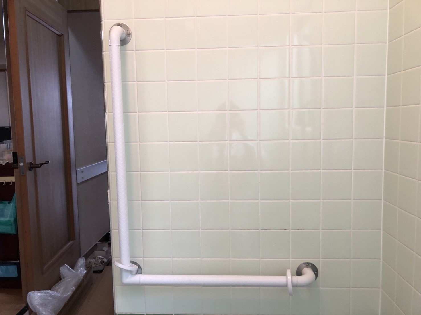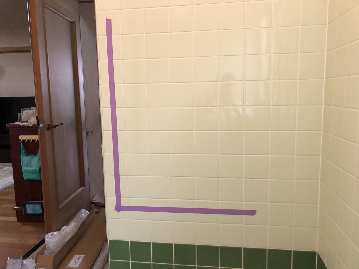 八尾市で介護保険を使って浴室にL字型の手すりを取り付けつけることになりました。 まずは施工する位置を決めてマスキングテープで印をつけました。