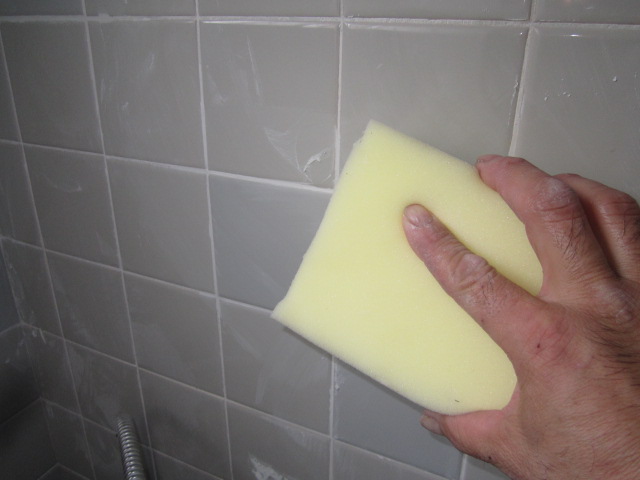タイルは圧着張りで貼り付け、目地セメントをきれいにふき取ります。