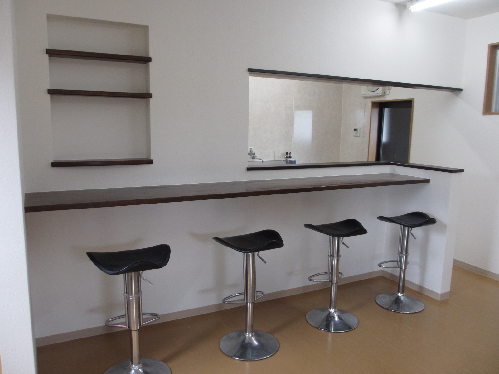 カウンター裏は、厨房。手前に作業台を置く予定。腰壁は、キッチンパネルで仕上げました。