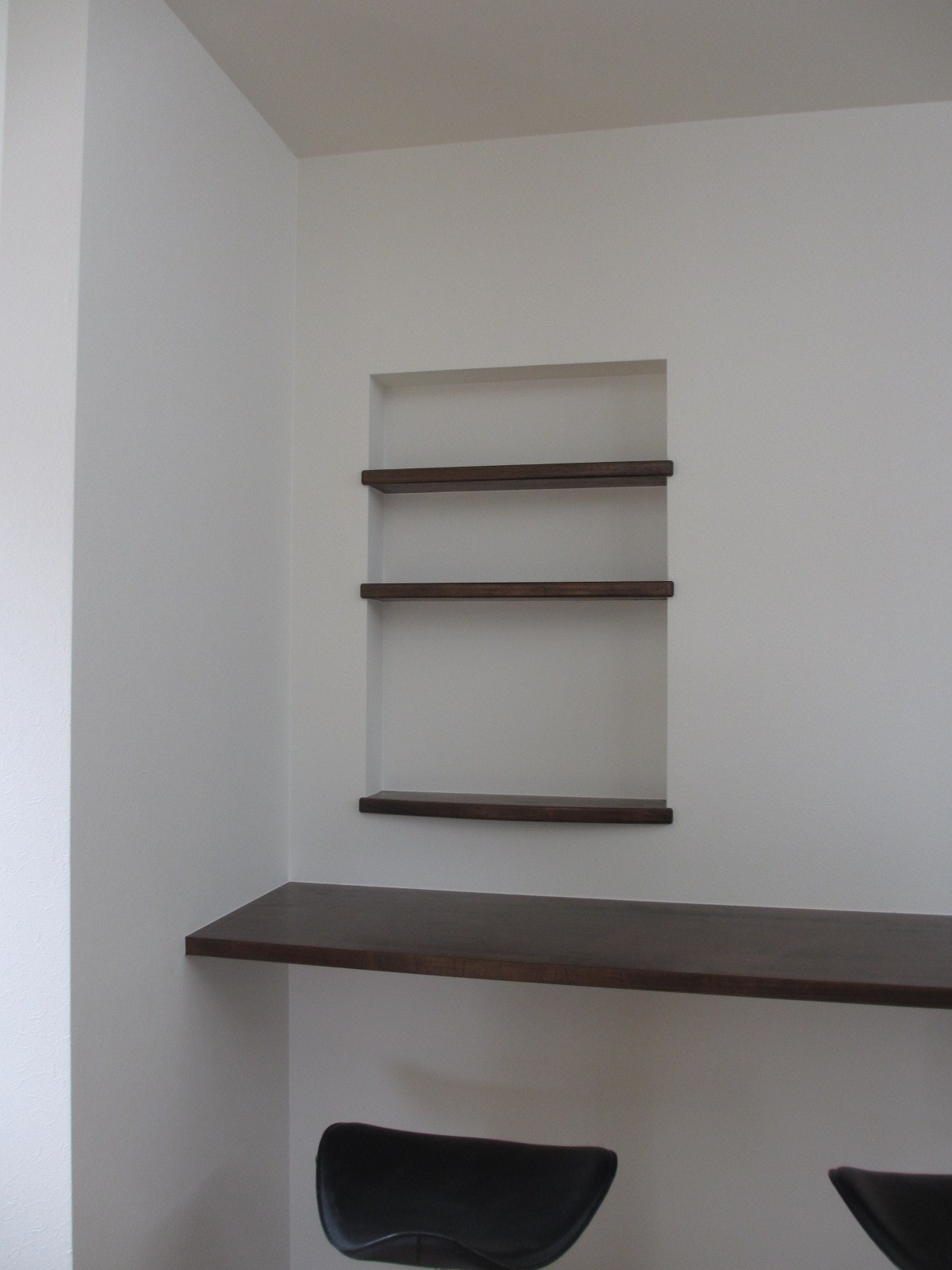 大工さんで作ってもらったニッチ。カップや飾り物を並べる棚をランダムにつけてもらいました。