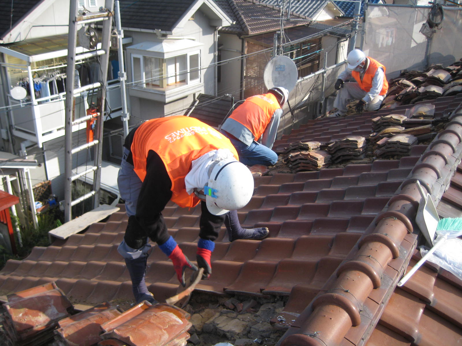 瓦のめくり作業・・・古い瓦は土で葺いてますのでかなりの重量が屋根にかかってます。