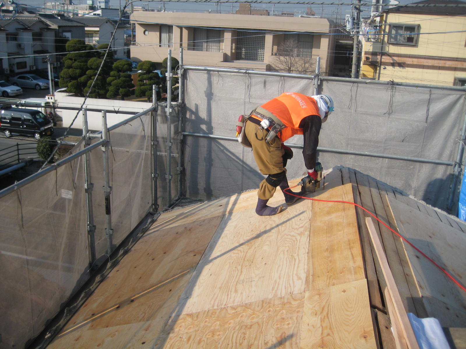 胴縁(桟)をルーフィングの上に打ち付け陶器瓦をステンレス釘で止めます。